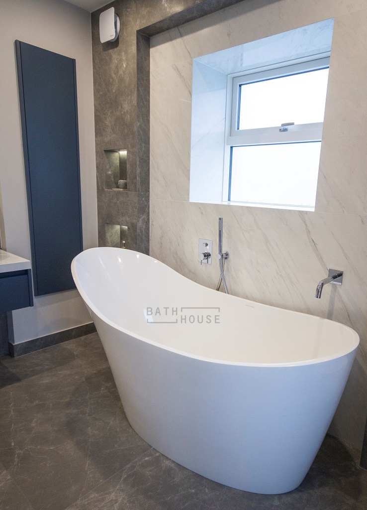 Brassware: Crosswater Kai 2 Hole Wall Mounted Mixer (Vanity). Kai Lever 2 Way Thermostatic Valve with Central Shower Head, Hansgrohe Raindance Select S Rail Set & Tece Drainline Linear Drain (Shower). Kai Lever Manual Valve, Inaqua Handheld Shower & Riga Spout (Bath).