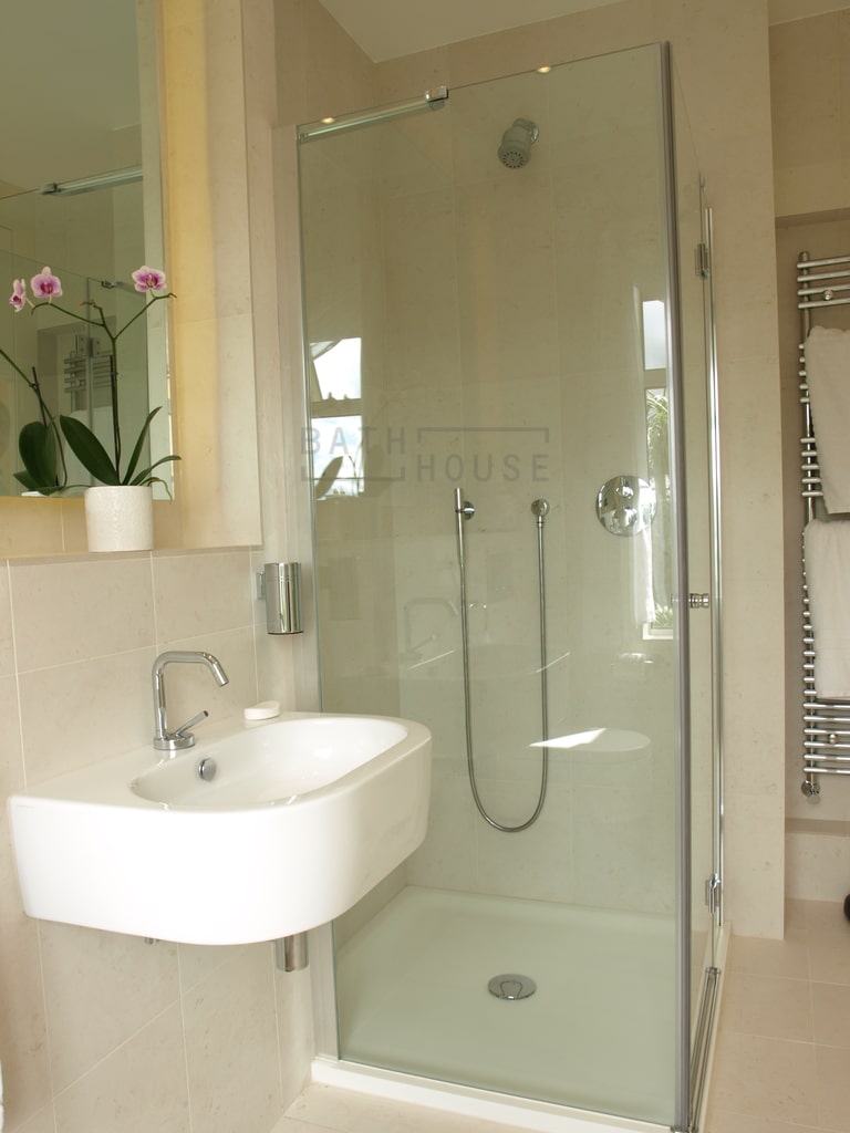Brassware: Hansgrohe Ecostat Shower Diverter, Hansgrohe Clubmaster Shower Head & Arm & Crosswater Chrome Wall Mounted Handheld Shower.