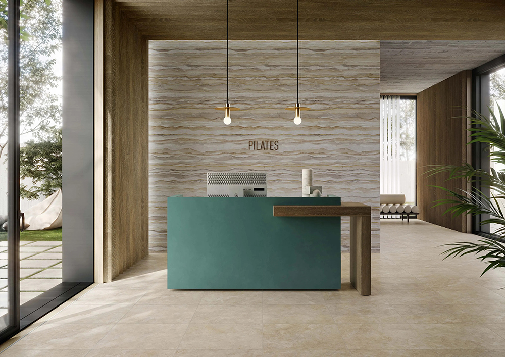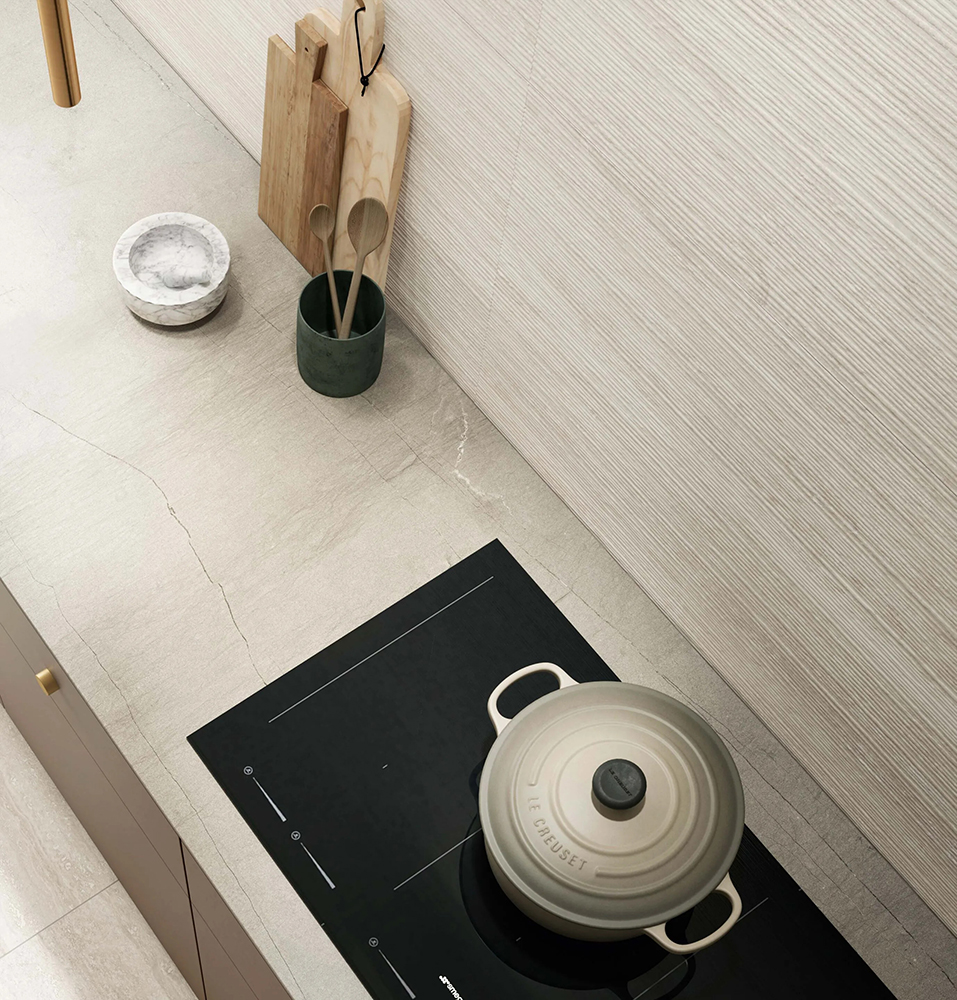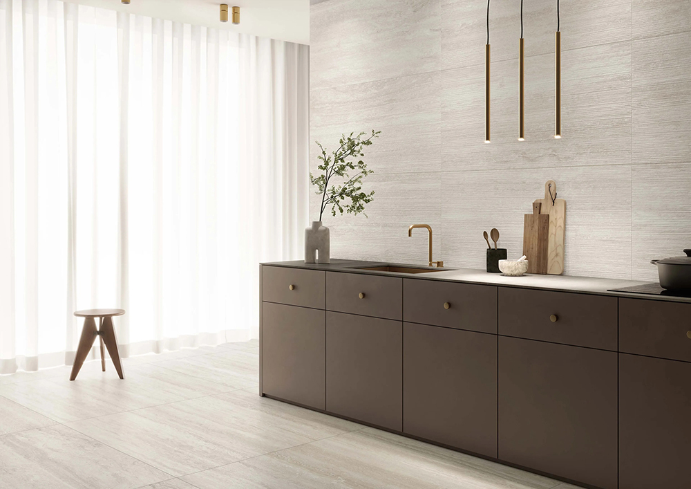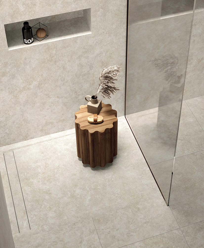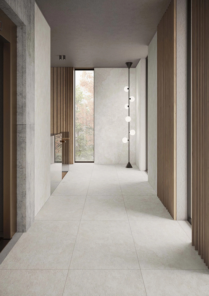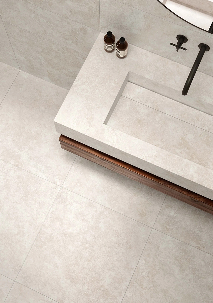 Both versions combine stone’s charm and porcelain stoneware’s sturdiness. Delicate earthy shades, beautiful streaks, and a three-dimensional play of light and shadow give these tiles a texture full of charm and elegance.