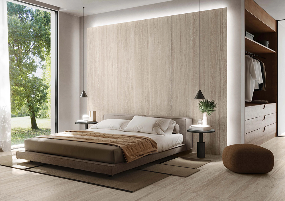 Casalgrande Padana’s Pietra Tiburtina collection comes in both a vein-cut version, which emphasises the lengthwise layers of limestone, and a cross-cut version, with an antiqued finish also available, which highlights the subtle cloud-like effects and gives the tiles an aged flavour of times gone by.