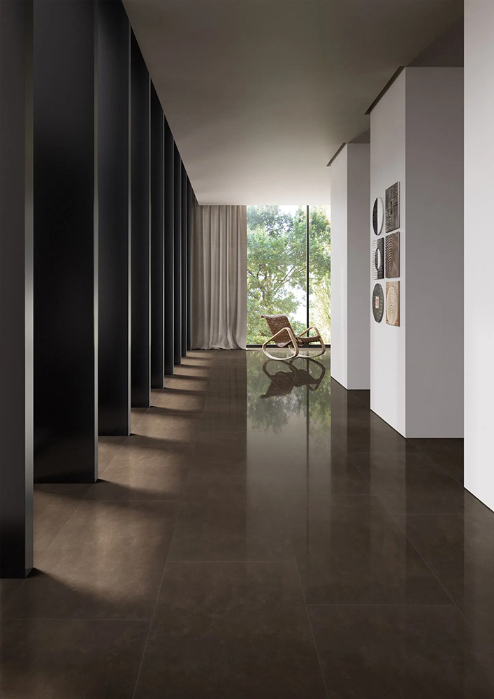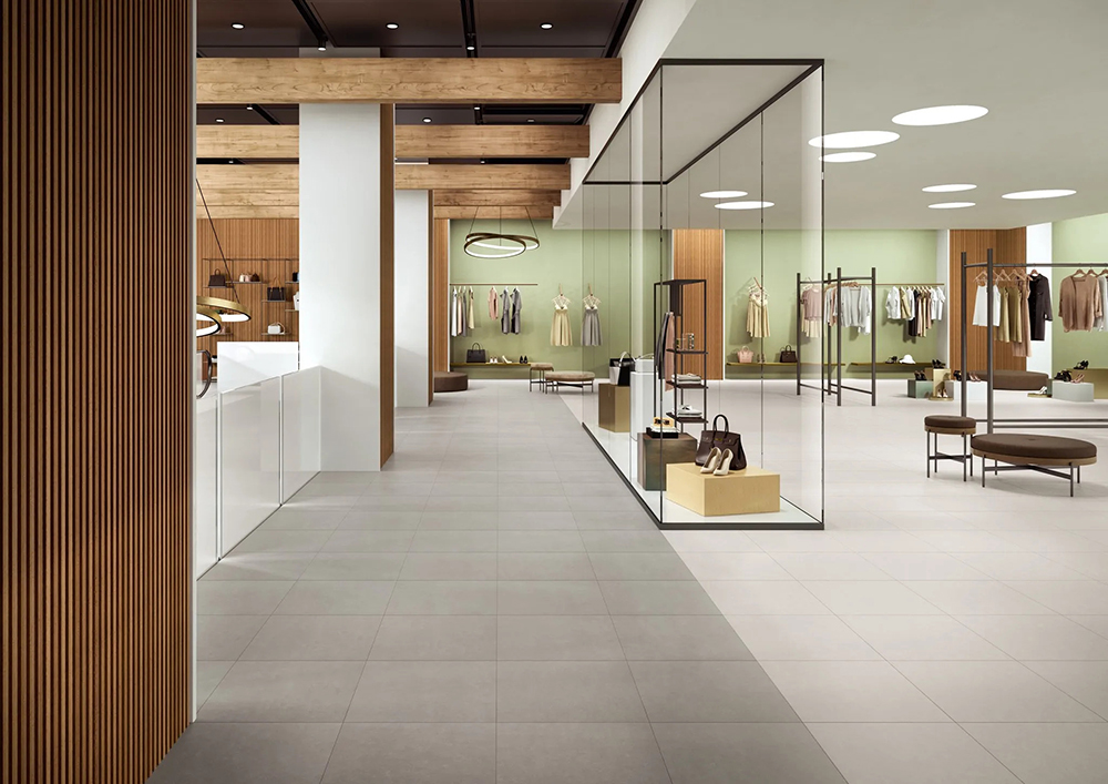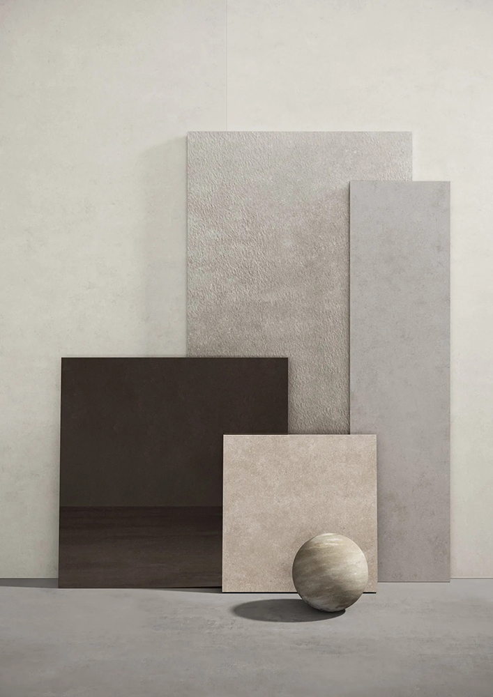 It comes in five colours (Charcoal, Ice, Seal, Taupe, and Thunder), three formats (30×60 cm, 60×60 cm, and 60×120 cm), three finishes (natural, polished, and bush hammered), and a 9.4 mm thickness, except for the 60×60 cm format in Ice and Taupe, which is 14 mm thick and has a natural finish.