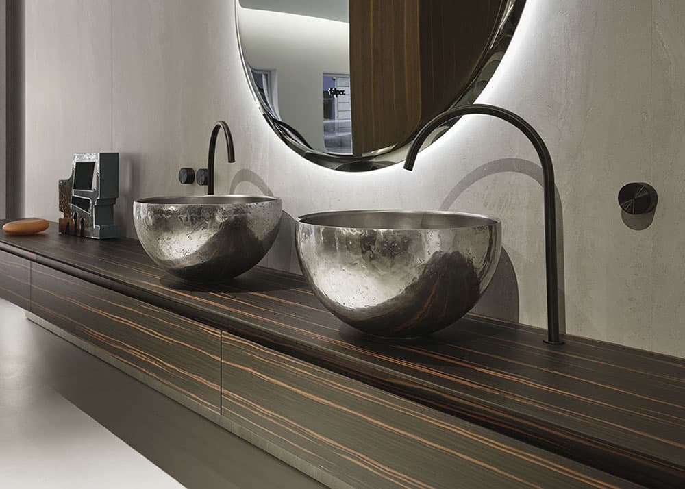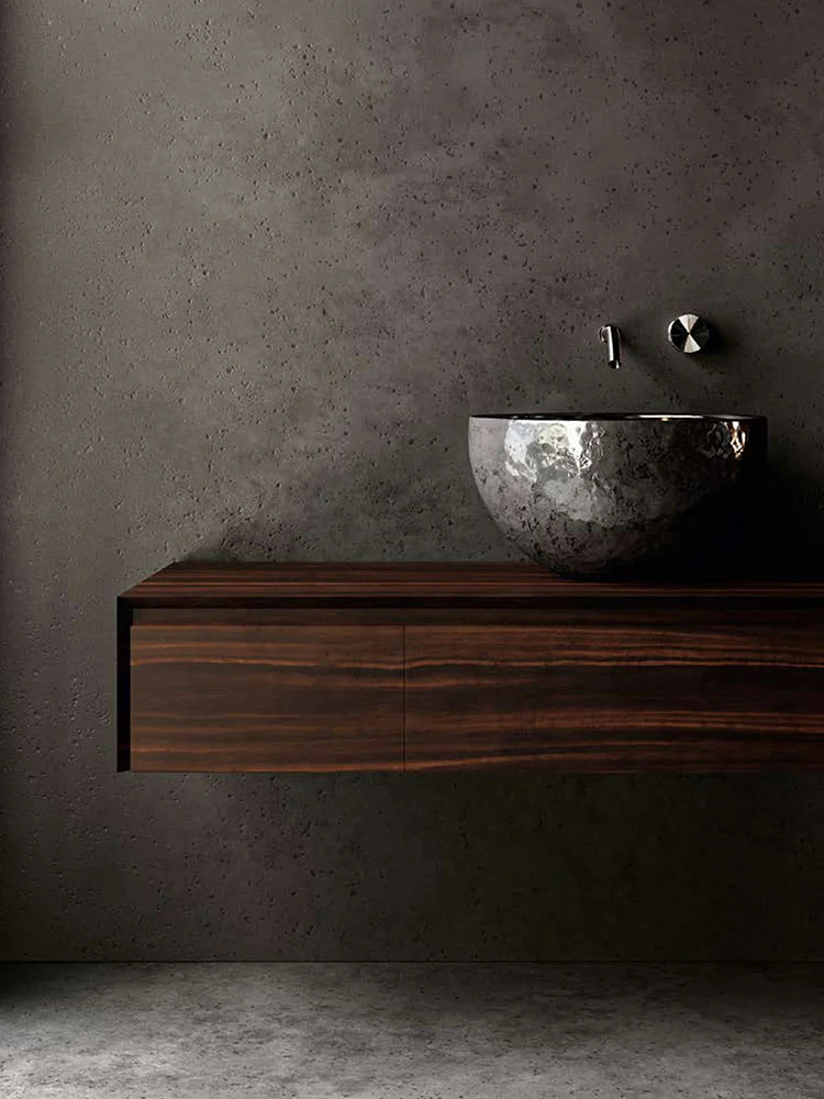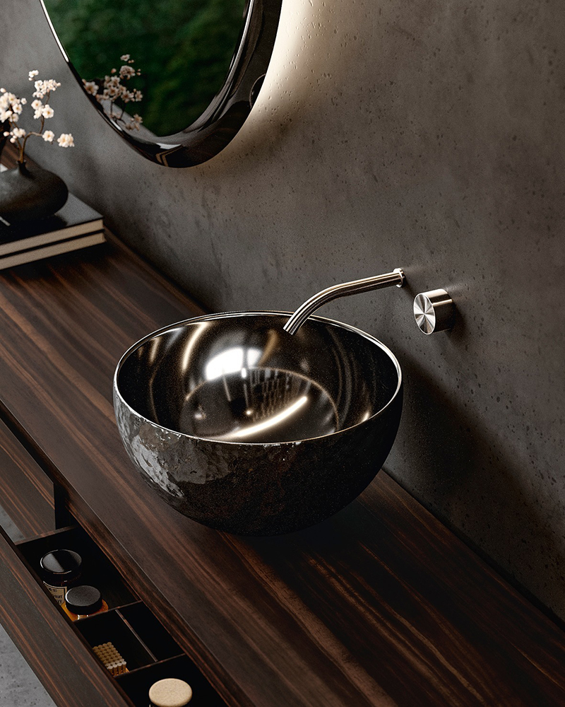 The Alchímia washbasin finds its rightful place not only in luxury residential settings, where it becomes the centrepiece of the bathroom, but also in exclusive hotel suites and spas. Its ability to harmonise with refined and contemporary architectures allows it to transcend conventional functionality, enriching the entire environment with a touch of elegance and distinction. This piece of design inspiration goes beyond mere aesthetics, reinterpreting space and everyday living with an extraordinary vision.