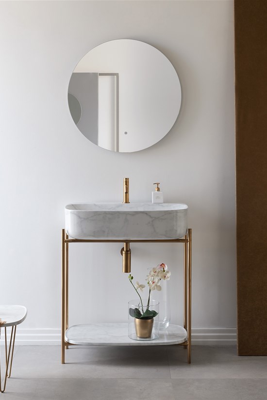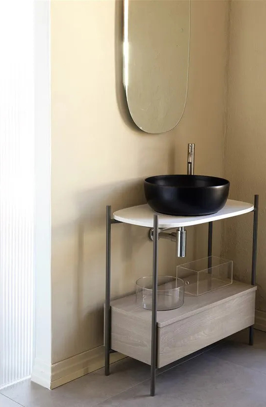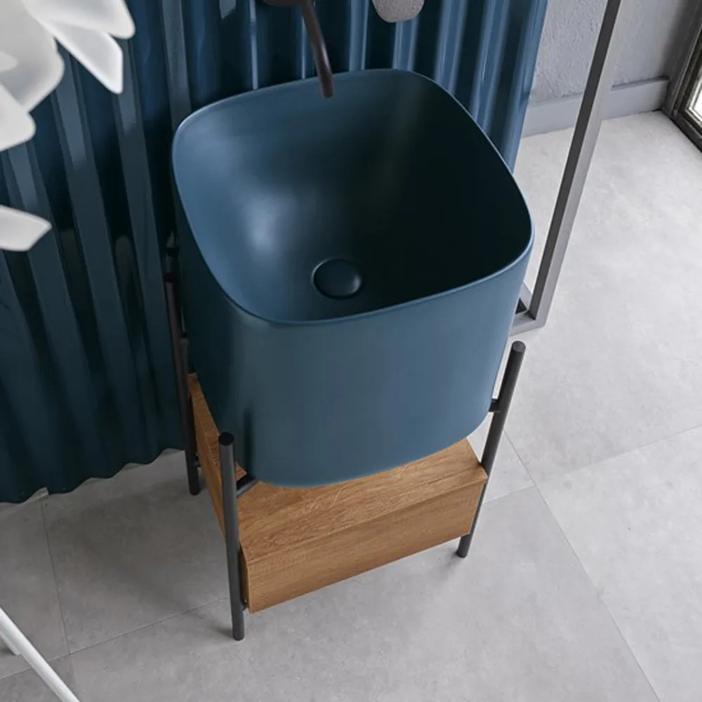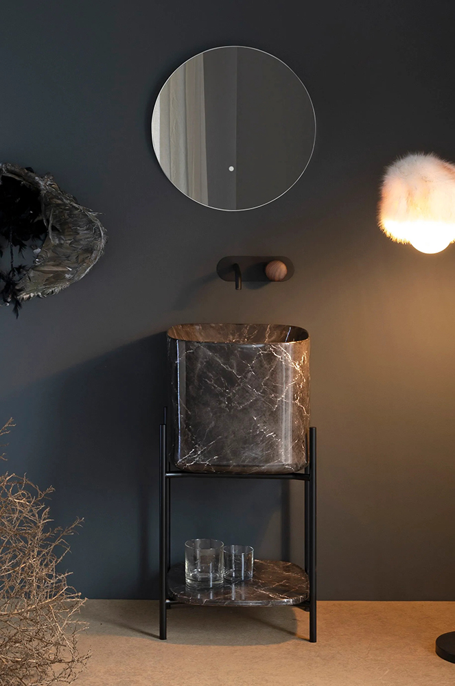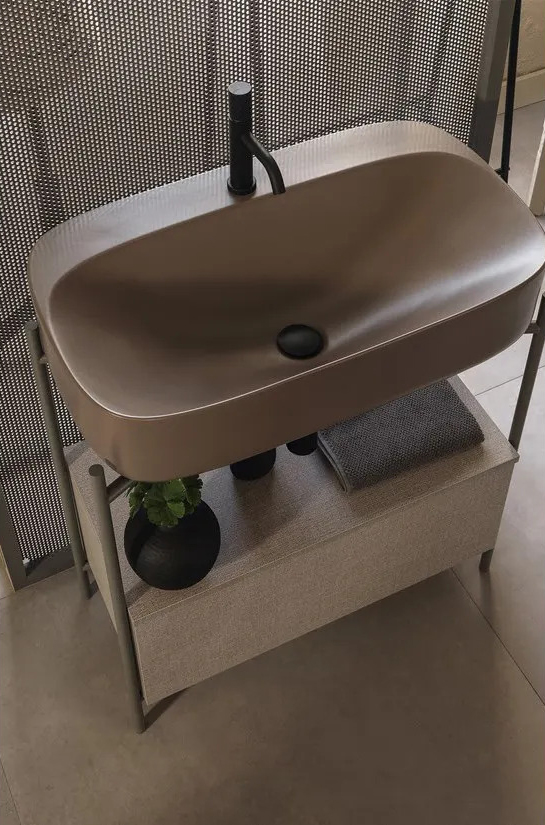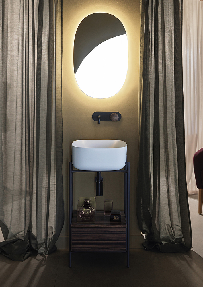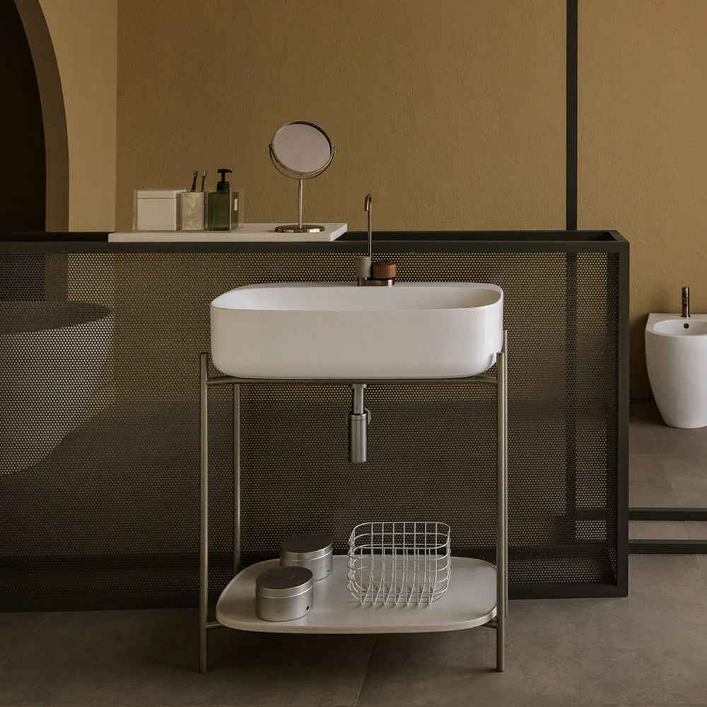 Laila is characterized by a pleasing contrast between the wide size of the bowl and the fineness of its edges, which is a distinguishing feature of the Moon collection. The tubular metal structure holds the impressive presence of the washbasin with a strong personality, creating a perfect harmony of shapes.