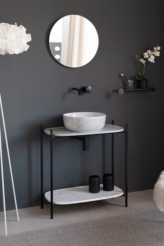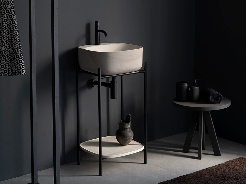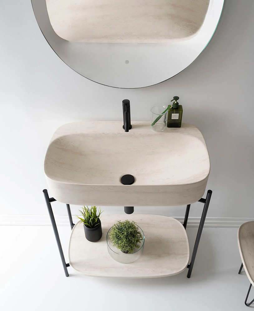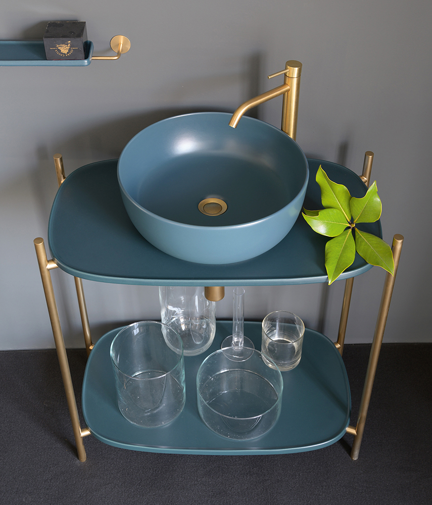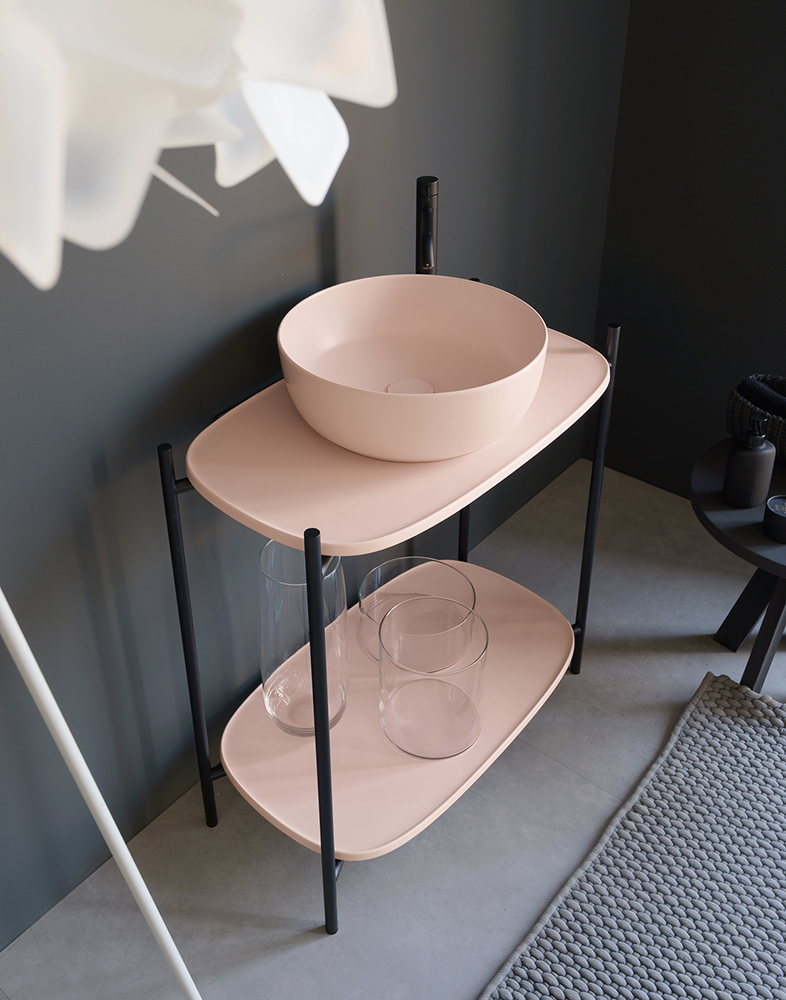 Shelves are also available in enamelled ceramic with Pearl, Slate grey, Lava, Ash, Tobacco, Sand, matt Blue, matt Rose, matt Green finish, and finally white, black marble and travertine.