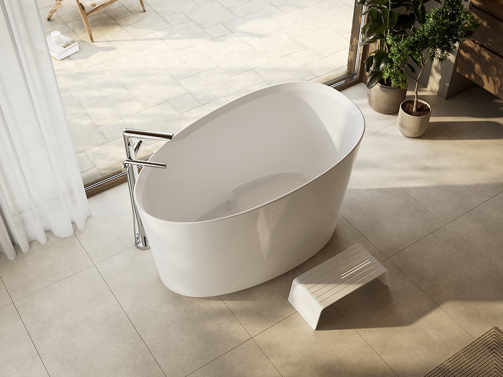 The Kerid bath is shorter and higher than a conventional freestanding bath, at just 135cm long (15cm shorter than the brand’s range of compact baths) and 85cm high. The base of the bath has a seated end, allowing for a deeper submersion, making the bathtub ideal for both hot soaks and cold plunges.